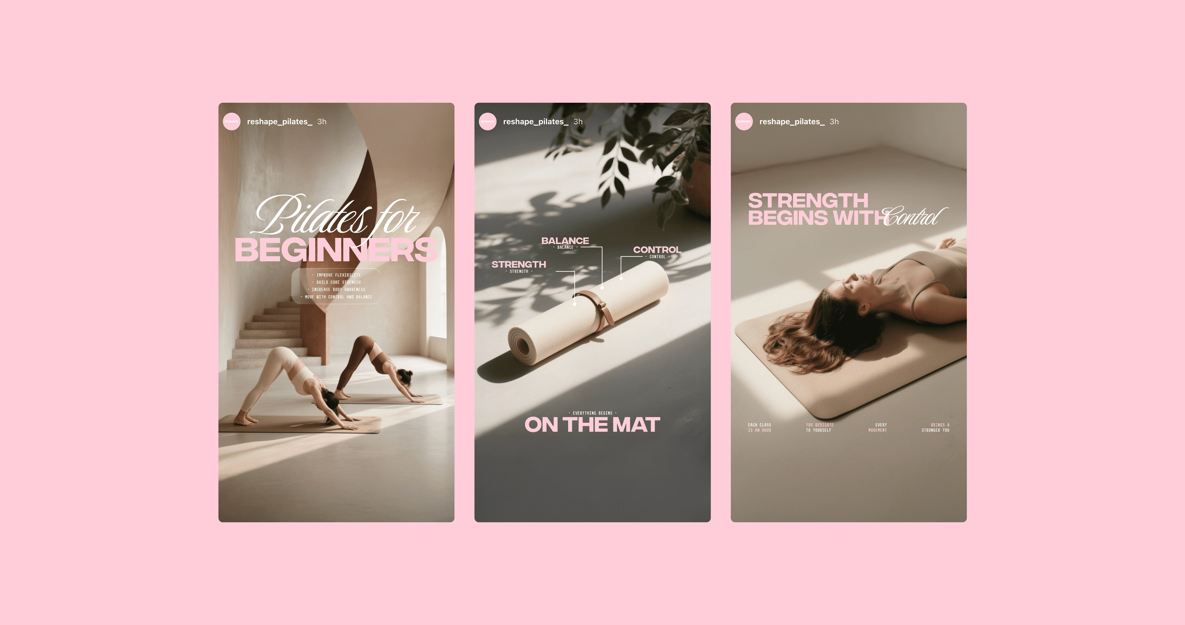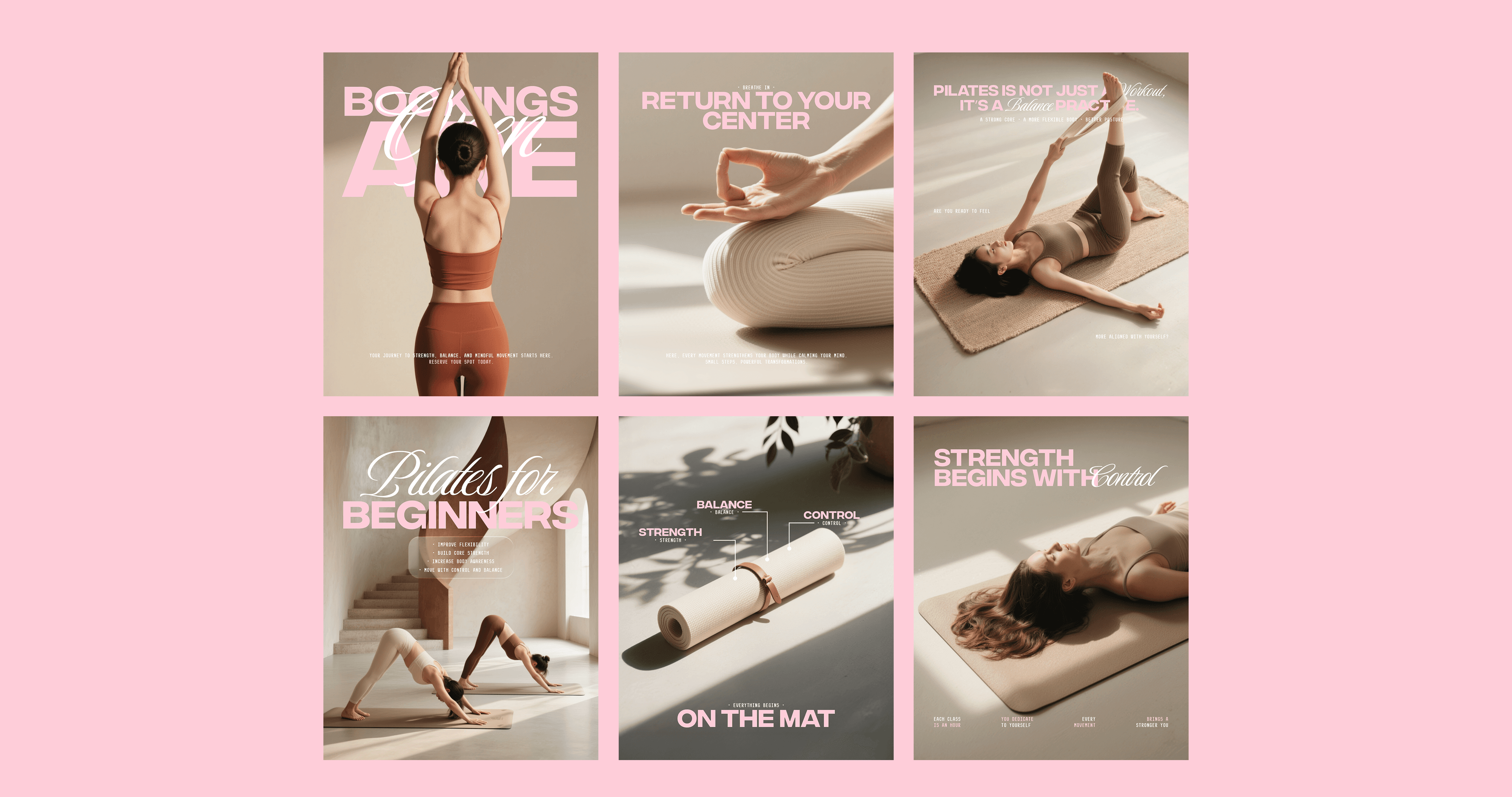 Shaped by a minimal and fluid design language, the logo and visual system offer a refined yet expressive brand identity that aligns with the balance between body and mind inherent to pilates. Through the art direction process, the brand’s aesthetic was translated into the digital space, resulting in a cohesive and impactful visual narrative across social media.